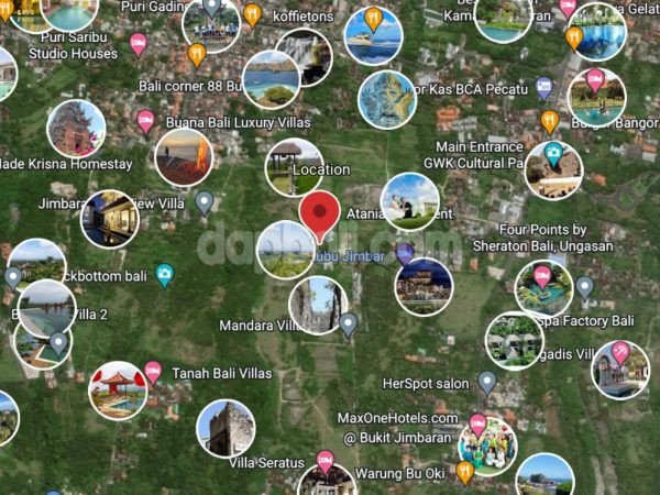 Strategically located only 1.3 km from Garuda wisnu kencana statue or approximately 6 minutes driving to GWK statue, and 1.8 km from MaxOne Hotel Jimbaran ( 8 minutes driving ). Well surrounded by private villas, coffee shop, supermarket and hotels. Overlooking the blue bali ocean, airport, Bali Mandara Toll road and a beautiful mountain in Bali