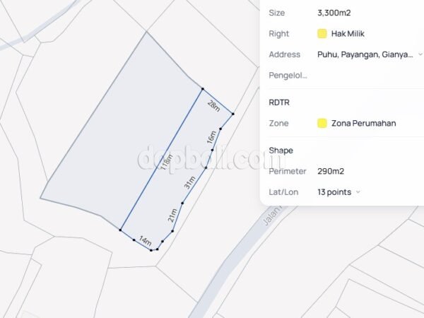 Boasts an area of 1.4 acres with stunning views seen from all views of the land such as forest, clear blue sky and lush tropical greenery. Situated in the tranquil area of Ubud, this expansive land offers an opportunity to build a wonderful retreat destination such as villas or resorts featuring infinity outdoor swimming pool. Here guest can immerse into nature and get a truly tranquility, away from massive crowds and traffics. Located approximately 30 minutes drive from Central Ubud and the iconic attraction Tegallalang Rice Terraces. This land is ready to build and it’s safe as it ideally located in Yellow/Residential zoning and very close to public facilities and local residence. Furthermore, it’s easy to access the location too and the area is very tidy which is suitable for residential complex too. The traditional aesthetics are evident from the moment you arrive to the village. A journey of exploring the island’s culture, nature and spiritual nuance is started here. A truly potential property for business or long term investment.