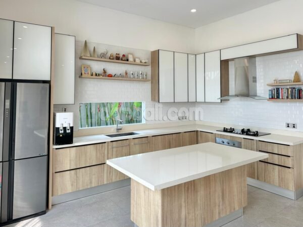 Crafted from a single slab of wood, this villa’s dining table is strategically placed next to the kitchen, in the middle between living room and kitchen. It is very nice and unique completed with six wooden seats. The fully-fitted kitchen is very nice and tidy with a window overlooks onto the garden, boast the homey tropical ambience.