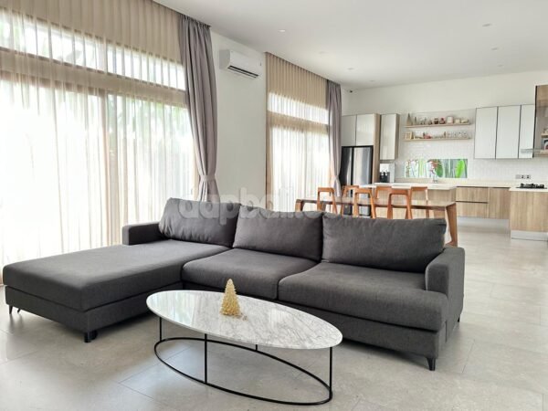 It is a beautiful light-filled room lined with floor-to-ceiling windows looking out to the pool and garden. The lofty ceiling gives the room the feel of an urban loft, while the cute sofa added with an oval coffee table.