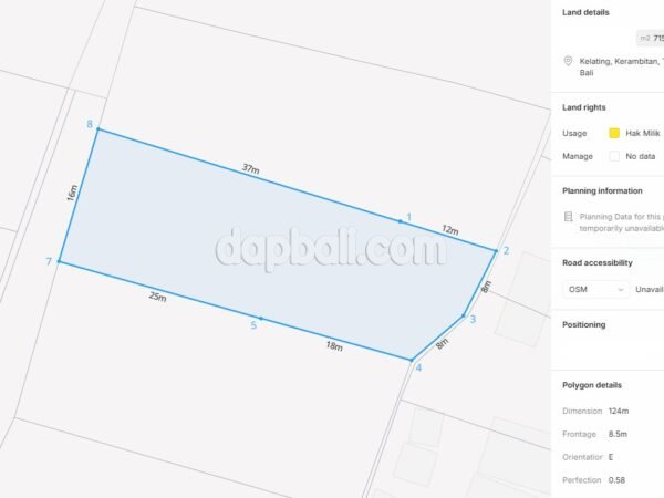 This prime plot is perfectly located just one kilometer from the stunning Kelating beach, offers a serene and peaceful atmosphere. Discover the rich cultural heritage and natural beauty at this beautiful village. Nestled in the western coast of Bali at Tabanan Regency, offers a convenient location surrounded by a myriad of landmarks and attractions. Just a short distance away, you’ll find the iconic Tanah Lot Temple, a sacred Hindu shrine perched on a rocky outcrop, providing breathtaking sunset views. Immerse yourself in the spiritual ambiance and witness traditional Balinese ceremonies that take place at this revered site.