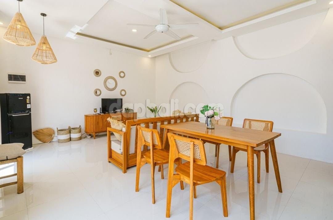The living room, which connects to both the dining room and kitchen, offers a view of the private pool. It is designed in a minimalistic style featuring cozy sofas and elegant decorations, which creates a warm and inviting atmosphere. The dining room has been beautifully completed with a nice dining table that has 4 seats, and it is seamlessly connected to the minimalist kitchen.
