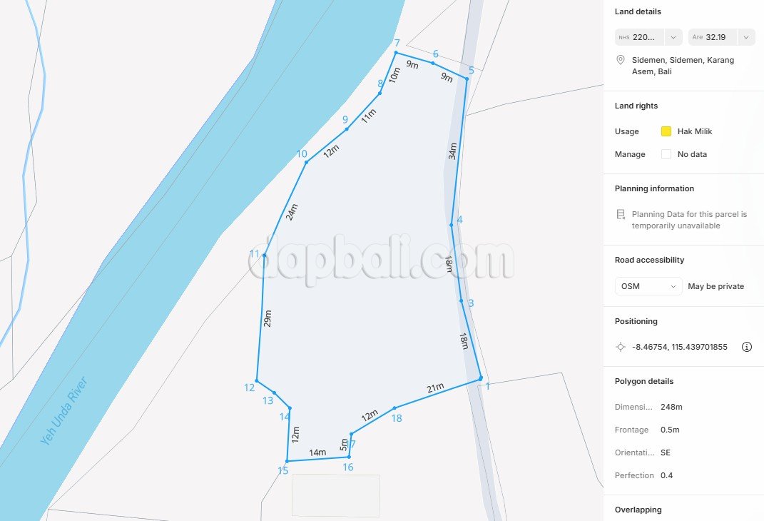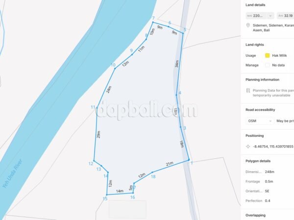 This picturesque vacant land is located in the eastern part of the paradise island – Bali, surrounded by verdant rice terraces, rolling hills, and the majestic Mount Agung. Nestled in the lush landscapes of Karangasem Regency at Sidemen village is a hidden gem that offers a serene escape from the bustling tourist areas. Known for its untouched natural beauty and traditional Balinese culture, Sidemen is a paradise for nature lovers and those seeking a peaceful retreat. The village is also home to traditional Balinese villages, where you can immerse yourself in the local way of life and witness age-old customs and rituals. The land features a 3400 sqm of total size, including the road is perfect for developing business investment, such as building a boutique resort, luxury villa, or hotel, or even a private sanctuary as your second home away from home in Bali. This area offers a tranquil atmosphere, ideal for travelers seeking a peaceful retreat. With breathtaking natural scenery and a strategic location close to the locale, this place is perfect for anyone wanting to relax and recharge. A leisurely walk through the village allows you to connect with the community, while a guided trek offers a chance to discover the stunning countryside. In addition, Sidemen is also a popular destination for cycling enthusiasts, offering scenic routes through picturesque villages and breathtaking panoramas. Such a beautiful property that provides an abundance of potencies!