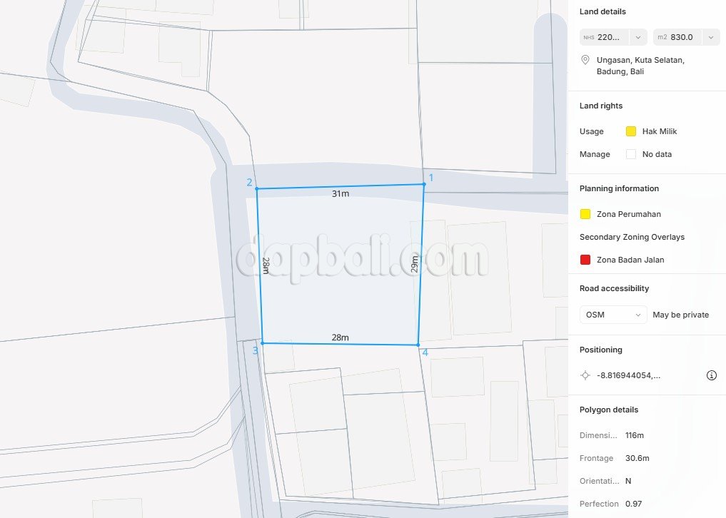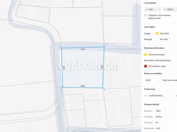 Discover this amazing land, which is located on the southern coast of Bali. Ungasan is a tranquil paradise that offers a perfect blend of breathtaking natural beauty and cultural richness. With its pristine beaches, dramatic cliffs, and awe-inspiring sunsets, Ungasan is a must-visit destination for travelers seeking a peaceful escape from the hustle and bustle of everyday life. This land offers an ideal location for constructing either a private luxury villa or a complex, providing the perfect balance of serenity and convenience. The land is perfectly situated in a Yellow/Residential zoning within a Villa environment, providing unmatched privacy and a beautiful view of green landscapes. It’s conveniently only a short 12-minute drive to Melasti beach, 15 minutes to Sundays Beach Club, and only a 45-minute drive from Ngurah Rai International Airport. This region presents a unique opportunity for an unforgettable experience, allowing you to find peace in a beautiful, natural setting. A place that gives you a chance to enhance your business instinct and promises a great investment somehow.