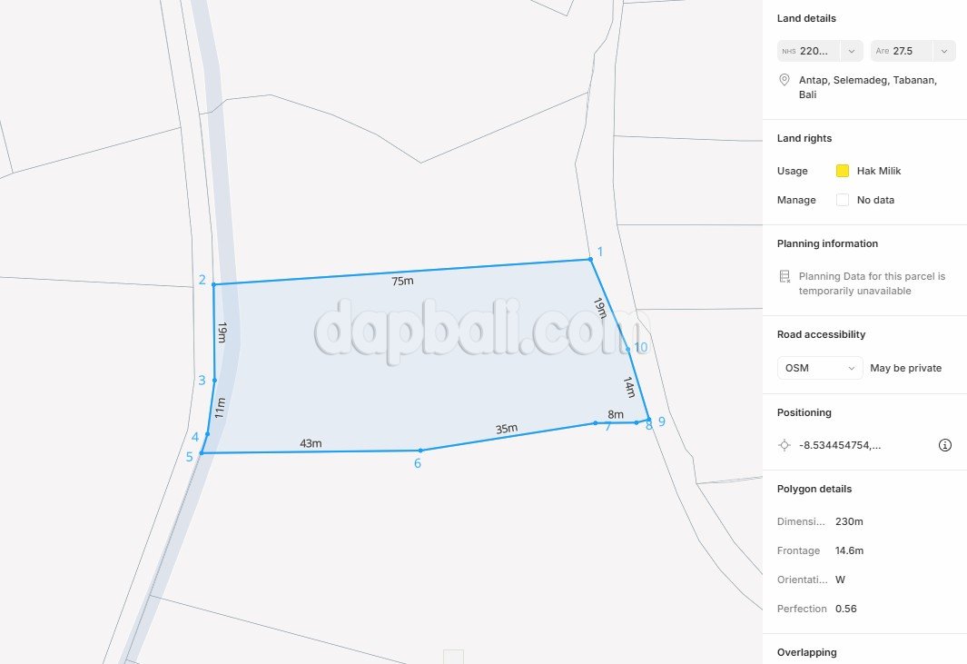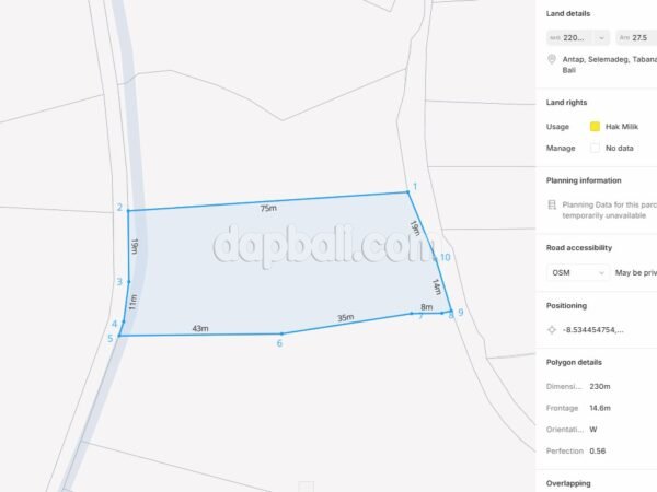 Located in one of the most scenic areas of Bali, this beautiful seaside property offers an ideal setting to create a family retreat where you can immerse yourself in authentic Balinese life and culture. Nestled in a small village of Antap, approximately 25km north of the famous sea temple Tanah Lot, surrounded by Tabanan’s endless rice terraces, mountain skylines and lush greenery. This area offers an unparalleled experience with its proximity to some of the island’s most captivating landmarks, stunning beaches and sunsets, a perfect place for relaxation and rejuvenation in the heart of Bali. Features a 2750 sqm of land, within walking distance from the beach approximately 600 meters away. A place where you can witness and experience the authentic Balinese way of life. Investing in this area by constructing a commercial villa or resort will be a wise decision, with the potential for very good returns in the long run. This property is ideally located in a tourism zone and comes with all the necessary infrastructure and amenities, ensuring a safe building process since the required documents are available and valid.