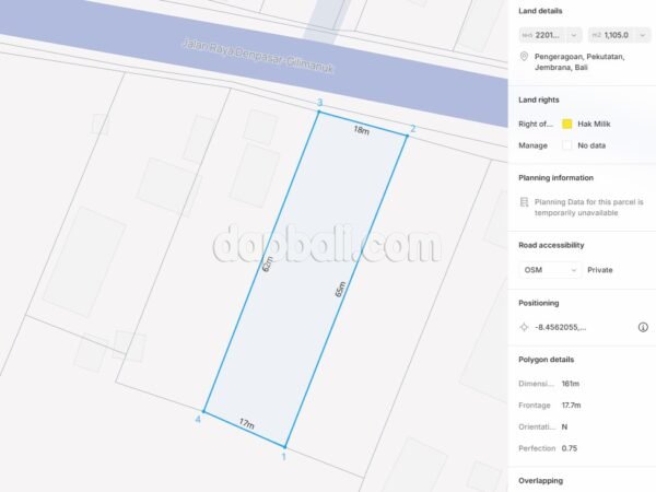 This land offers a serene and idyllic ambience, making it the perfect location for creating an escape for those seeking tranquility. Nestled amidst the stunning beauty of Bali, exotically located at the beachfront of Pengeragoan, Jembrana, a perfect destination for those looking to unwind and rejuvenate. This secluded destination offers a pristine rural atmosphere, it’s private, tranquil and spared out the hustle and bustle city life. Supported with a good infrastructure and positioned right on the main road side make it easy access and will be perfect to build a boutique resort, luxury villa, restaurant, and even suitable for long term investment. Boasts a 1105 sqm of land and has a flat and solid contour which is ready to build. It would be a hidden gem that offers a peaceful retreat away from the bustling crowds of the island’s popular tourist destinations. Known for its untouched natural beauty and laid-back atmosphere, this area (Jembrana) is the perfect destination for those seeking a tranquil escape. Whether you’re seeking relaxation, adventure, or a cultural experience, this area has something to offer for everyone. With its serene surroundings and warm hospitality of the locale neighbors, no wonder that area is becoming a popular destination for travelers looking to experience the true essence of Bali. Don’t miss the opportunity to witness and experience the unique traditions of Balinese, showcasing the rich cultural heritage of the island.