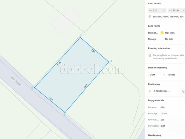 42984 – Small prime plot of 252 sqm for sale, located just a short drive from Nyanyi beach, Tabanan