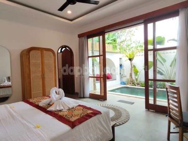 Stands on 200 sqm of land with total building area is 150 sqm, this villa is suitable for a family home away from home; a place to escape the realities of hectic lives in big cities. It’s a place designed to allow you to feel the comfort of home while experiencing authentic vibes of the uniqueness Balinese way of life, without sacrificing the comfort living. Nestled in a traditional Balinese village of Kedungu at Tabanan Regency, offers a serene environment for you who are seeking a tranquil getaway. With its unique design and lush greenery surroundings, this villa provides a perfect blend of comfort and natural beauty. Features two-bedroom ensuite, you can expect a total privacy and a cozy atmosphere throughout your stay. Brings out a modern minimalist style that seamlessly blend with contemporary aesthetic and its natural tropical surroundings. Featuring floor-to-ceiling glass windows that’s overlooking onto the pool, garden, and the lush greeneries surroundings create a multi-faceted and tranquil tropics ambiance.