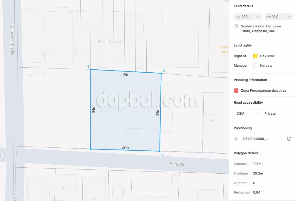 In the center of Renon is the heart of Denpasar, which is the capital city of the Bali island province. The land located on Pemuda’s main road is an excellent spot for establishing a culinary center, as it is just 150 meters from Puputan. With its prime location just a short walk from Renon Park, this land is ideal for a shop or office. It is also perfect for creating an elite boarding house due to its accessibility and proximity to key areas. The land measures 1000 sqm and has a frontage of 29 meters, making it an excellent choice for development. With a 7-meter access road, the property is conveniently located in a Red/Mix zoning area suitable for trade and service. This solid flat land is ideally situated for construction, ensuring ease of building for prospective buyers. Such an amazing property, so if you plan for business investment in Bali, this might be the best option without doubting of disadvantage but get a high return surely, as known that Renon is the most coveted area for business or living, is close to anywhere like school, university, hospitals, government offices, shopping, leisure, eateries, attractions, etc. As you stroll through the area, the village atmosphere envelops you with vibrant greenery on both sides of the road, making it an inviting place.
