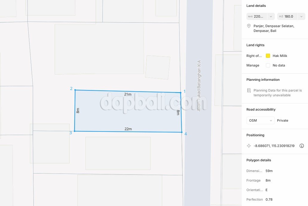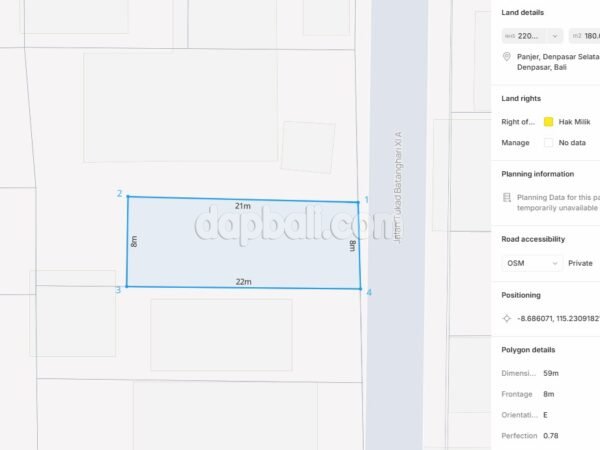 This premium land is ideal for building your dream home, providing a unique opportunity to create a personalized living space. Due to its strategic location, this space is perfect for not only opening a shop or an office but also for setting up a premium boarding house that meets business requirements. By investing in this premium land, not only you are securing a valuable asset, but you’re also positioning yourself for potential high returns later on. Located in the center of Renon, you can experience the lively atmosphere of Denpasar, the bustling capital city of Bali. This plot is situated just a short drive from the culinary center and Sesetan area, nestled within a prestigious residential complex that offers a tranquil atmosphere for its residents. The land features 180 sqm with rectangular dimensions and has a flat, solid contour that is ready for construction. Well provided a wide 8-meter access road, conveniently located in a Yellow/Residential zoning. This property is perfect for those looking for a peaceful urban lifestyle in Denpasar and also giving you a chance for starting a business in the heart of Bali. This land would certainly be a great choice without doubt of disadvantages, as it is known that Renon is the most sought-after area for business or living.