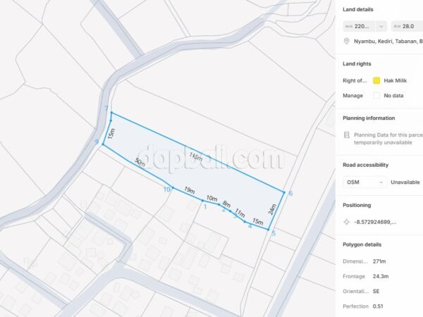 A rare opportunity to secure freehold land (SHM) in the peaceful yet strategic village of Nyambu, Kediri – Tabanan. Available starting from 10 are (1,000 sqm), these plots are ideal for those who dream of building a private villa, family residence, or investment property in one of Bali’s most authentic and fast-growing areas.