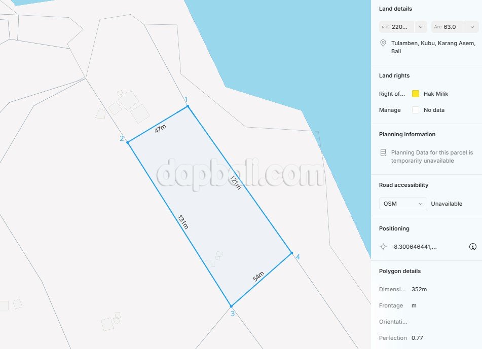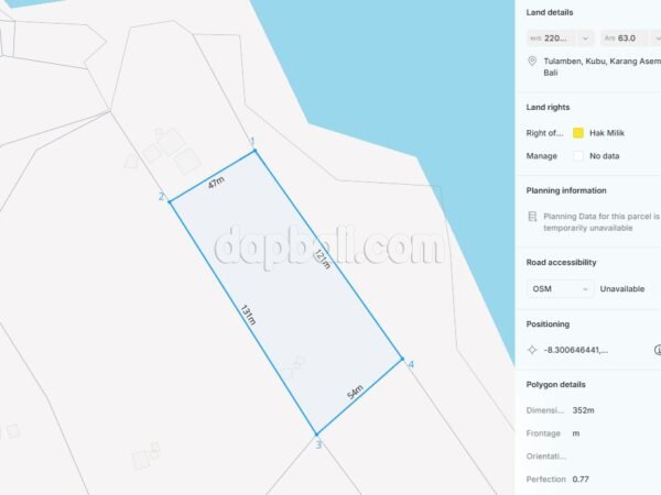 Located at the North-East coast, right in front of the stunning Sparkling black sand Tulamben beach, and close to several amenities. This prime land is ideal for developing tourist accommodations, such as resorts, villas, and more. Situated near the Dive Concept center in Kubu village, this land is Bali’s hidden gem, boasting remarkable dive spots that enchant countless divers. Nestled away from the hustle of the main road, this stunning escape provides a serene haven for divers, nature enthusiasts, and those seeking peace. The land is strategically located in a tourism zone, covering an area of 6300 sqm, right between Amed and Tulamben, making it perfect for investment. This property has a four-meter-wide access road, ensuring easy accessibility, and is fully equipped with all necessary amenities for immediate development. With its prime location between Amed and Tulamben, this site is ideal for any tourism-related projects, given its readiness to build. The tranquil environment, breathtaking views, and rich natural surroundings make Kubu in Tulamben, Karangasem, the perfect escape for anyone seeking relaxation from the city’s buzz. Discover the best underwater world right here in Kubu, Tulamben, where the serene atmosphere and exotic nature invite you to explore and unwind.