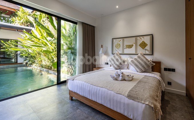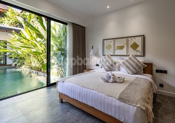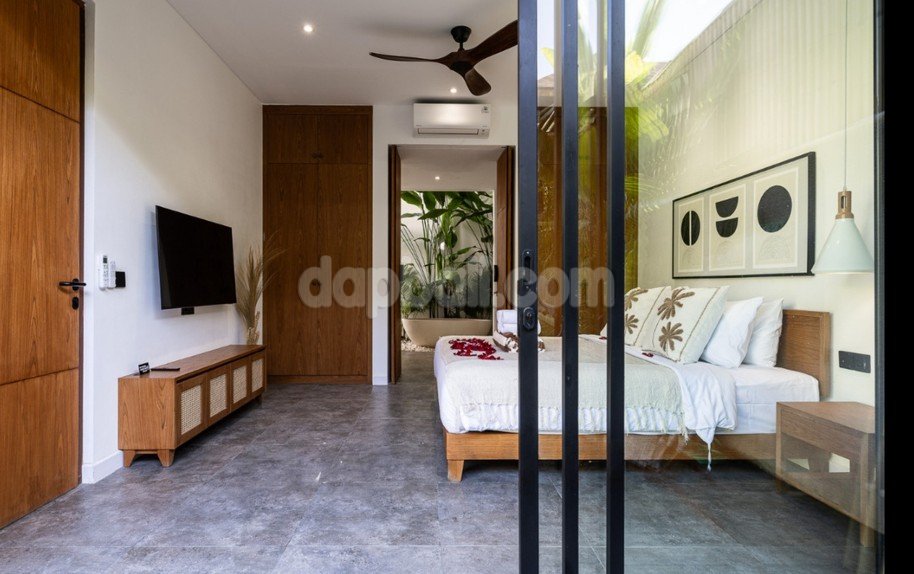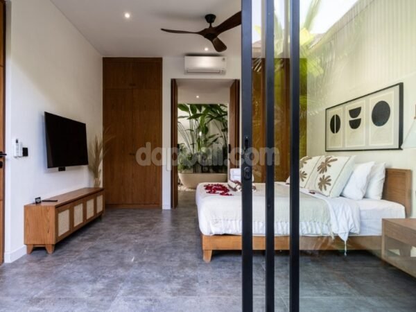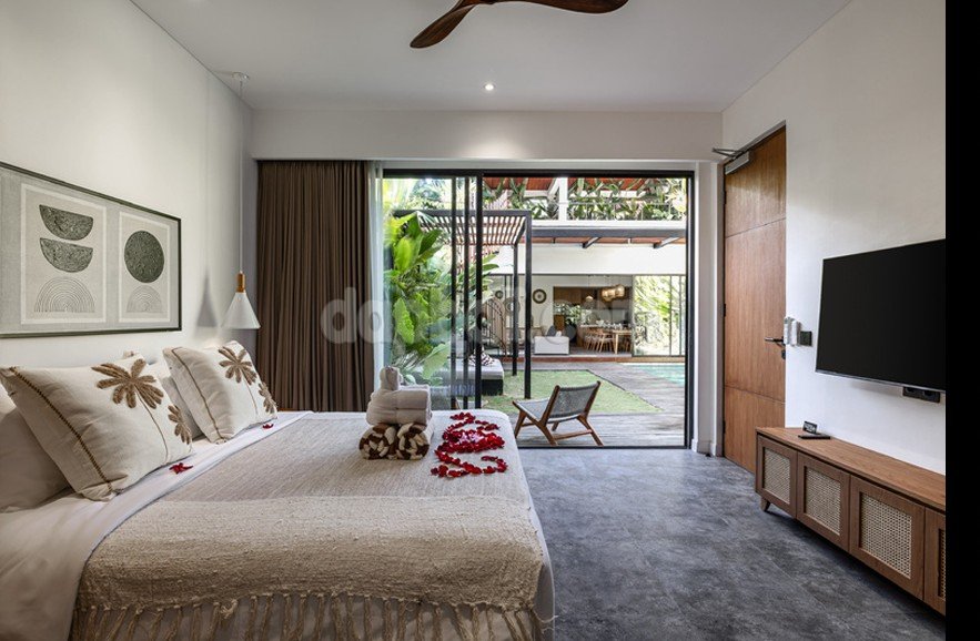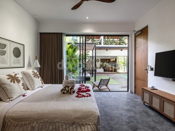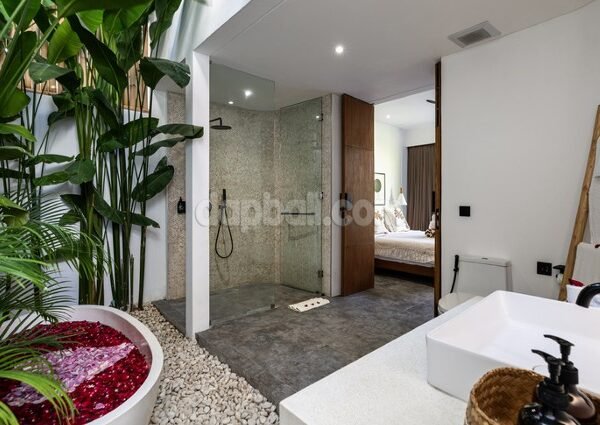 Wake up to lush tropical greenery right outside your window. This stylish bedroom offers direct views of the private pool through full-height sliding glass doors, blending indoor comfort with outdoor tranquility. The room is fully furnished with a modern wooden bedframe, soft neutral linens, and tasteful décor, creating a warm yet sophisticated ambiance. Natural light floods the space, while blackout curtains ensure restful sleep. Perfectly designed for both relaxation and functionality, this bedroom embodies the villa’s modern tropical lifestyle. The master bedroom ensuite a tropical spa-inspired bathroom that blends luxury with nature, featuring an open-concept design surrounded by lush greenery. A modern walk-in rain shower is complemented by sleek stone finishes and minimalist fixtures, creating a clean, refreshing atmosphere. The highlight is the garden bathtub, adorned with flower petals and set against tropical plants, offering a private sanctuary for relaxation and rejuvenation. Combining natural textures with contemporary comfort, this space captures the essence of a modern Bali retreat.