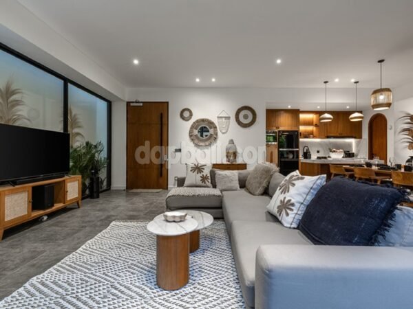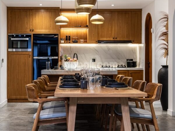 Entertain in style with a custom-designed wooden dining table that seats eight comfortably. The modern kitchen is fully equipped with high-end appliances, natural wood cabinetry, and ambient lighting — ideal for both family meals and hosting guests.