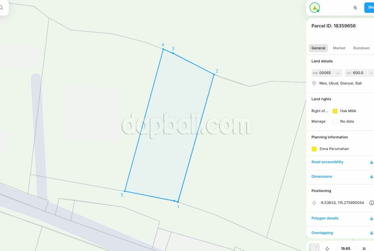 Strategically located in Mas, Ubud, just minutes from central Ubud, this 600 m² (6 are) land offers an exceptional blend of privacy, prestige, and natural beauty. With unobstructed views of lush rice fields, it provides the kind of serene, picturesque backdrop that international guests actively seek. The property is surrounded by tropical greenery and authentic Balinese cultural landmarks, enriching the sense of place and heritage. Access is seamless via a 4-meter-wide paved road ideal for both development logistics and future guest convenience. The land is perfectly flat and construction-ready, significantly reducing prep costs and speeding up the build timeline, making it an ideal site for a private villa or boutique hospitality project.