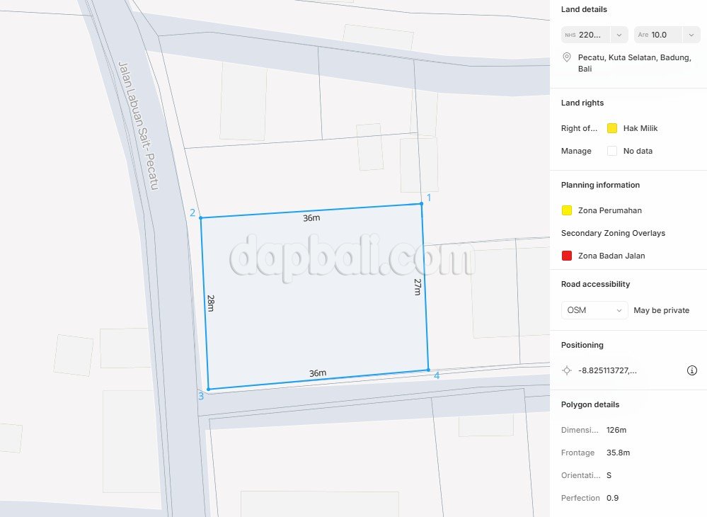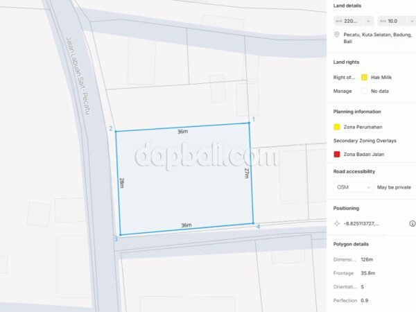 An exceptional opportunity awaits on the iconic Labuan Sait main road, one of Bali’s most sought-after corridors connecting Padang Padang, Bingin, and Uluwatu. This 10-acre corner plot (hook position) sits directly on the main road, offering maximum visibility and accessibility — ideal for both residential and commercial development. Its rectangular shape and elevated position make it easy to design a project that captures the natural light, tropical breeze, and ocean-inspired lifestyle that define the Bukit Peninsula. Surrounded by high-end villas, luxury resorts, and trending restaurants, this area is a magnet for investors and long-term residents alike. Within minutes, you can reach Padang Padang Beach, Thomas Beach, and Uluwatu’s world-famous surf spots — a location that ensures both lifestyle appeal and consistent rental demand.
