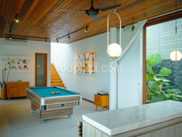 The living area is spacious and inviting, featuring high ceilings and en-closed layout that seamlessly connects to the dining and kitchen spaces. The use of neutral tones, natural wood, and soft furnishings creates a calming atmosphere that feels both luxurious and homely. The modern kitchen is both elegant and functional, fitted with premium cabinetry and contemporary finishes that make it ideal for cooking, entertaining, or simply enjoying a relaxed morning coffee while overlooking the pool. The villa embraces a minimalist yet warm interior concept. Each of the three bedrooms is a private retreat, designed with comfort and tranquility in mind. Large glass doors open to lush greenery, ensuring that every morning begins with the soft light of the tropics. The en-suite bathrooms feature sleek modern fittings paired with natural textures like stone and wood, evoking a boutique resort feel. A billiard room and dedicated office space add a layer of practicality and leisure, making the home suitable for both relaxation and productivity. Upstairs, a rooftop terrace and balcony offer panoramic views of the surrounding tropical landscape — the perfect place to enjoy Bali’s famous sunsets or a quiet evening under the stars. This villa represents the essence of Bali’s modern tropical lifestyle — elegant, comfortable, and deeply connected to nature. A timeless investment that offers not just a home, but a true living experience in paradise.