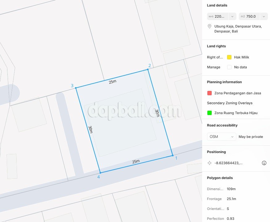 A strategically located freehold land for sale on Jalan Cargo, Denpasar, offering an excellent opportunity for commercial or residential development. This plot covers 750 square meters (7.5 are) with a wide frontage of approximately 25 meters and a depth of 30 meters, providing great proportions for efficient building design. The land faces south and enjoys direct access from an 8-meter-wide road, making it ideal for logistics, warehousing, or a modern housing complex. Situated in a rapidly developing area surrounded by commercial warehouses, retail shops, and housing projects, this property combines accessibility with high investment potential. The land is classified under ITR Perdagangan dan Jasa (Commercial & Service Zone), which allows for versatile development options — from storage facilities and showrooms to office complexes or business hubs. Its strategic position within Denpasar ensures smooth access to the city center, the Ngurah Rai International Airport, and key arterial roads leading to Kuta, Sanur, and Ubud. This property offers a prime investment opportunity in one of Denpasar’s most strategic commercial corridors — ideal for developers and business owners seeking long-term value in Bali’s growing capital area.