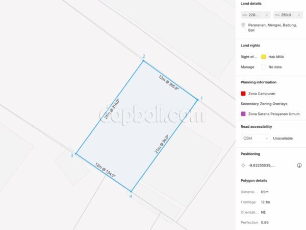 Secure this small yet valuable piece of land in one of Bali’s most desirable and fast-developing areas — Pererenan. Located just 5 minutes from Pererenan Beach, this plot offers an ideal setting for building a private villa or a compact investment property in a high-demand neighborhood. The land spans 2.25 are (225 sqm) and comes with a leasehold title, offering a secure long-term investment option. It is situated in a yellow zone (residential area), making it suitable for private residence or villa rental development. The plot enjoys good 4-meter road access, ensuring easy entry for cars and construction vehicles. Surrounded by well-designed villas and modern residences, the area has become one of the most popular destinations for both investors and expats seeking the tranquility of Canggu’s outskirts while remaining close to beaches, restaurants, and cafés. This land represents an affordable entry point into Pererenan’s premium property market — a rare opportunity to invest in a location where land availability is increasingly limited. Whether you’re planning to build a cozy private villa for own use or commercial purposes, this small plot offers exceptional potential in one of Bali’s most promising areas.