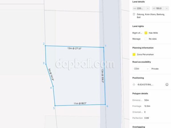 This 155 m² plot offers an excellent potential for both personal residence and investment projects such as a villa, guesthouse, or boarding house. The land has a 12-meter frontage, providing great design flexibility for future construction. Positioned facing east, it enjoys pleasant morning sunlight and natural ventilation throughout the day. The property sits on yellow zoning (residential area) and comes with a freehold certificate (SHM), ensuring full ownership security. One of the key advantages of this plot is its flood-free environment and concrete road access, making it highly convenient for everyday living. The surrounding neighborhood is peaceful and developed, yet still retains a local charm — an ideal balance between comfort and community. Located only 25 minutes from Canggu and Denpasar, and about 1 hour from Ngurah Rai International Airport, this land offers both convenience and investment appeal. This is an attractive entry point into Bali’s north Kuta property market — perfect for those looking to build a private home or create a profitable rental property in a highly demanded area. Don’t miss this great opportunity to secure a well-located plot in one of Bali’s fastest-developing regions.