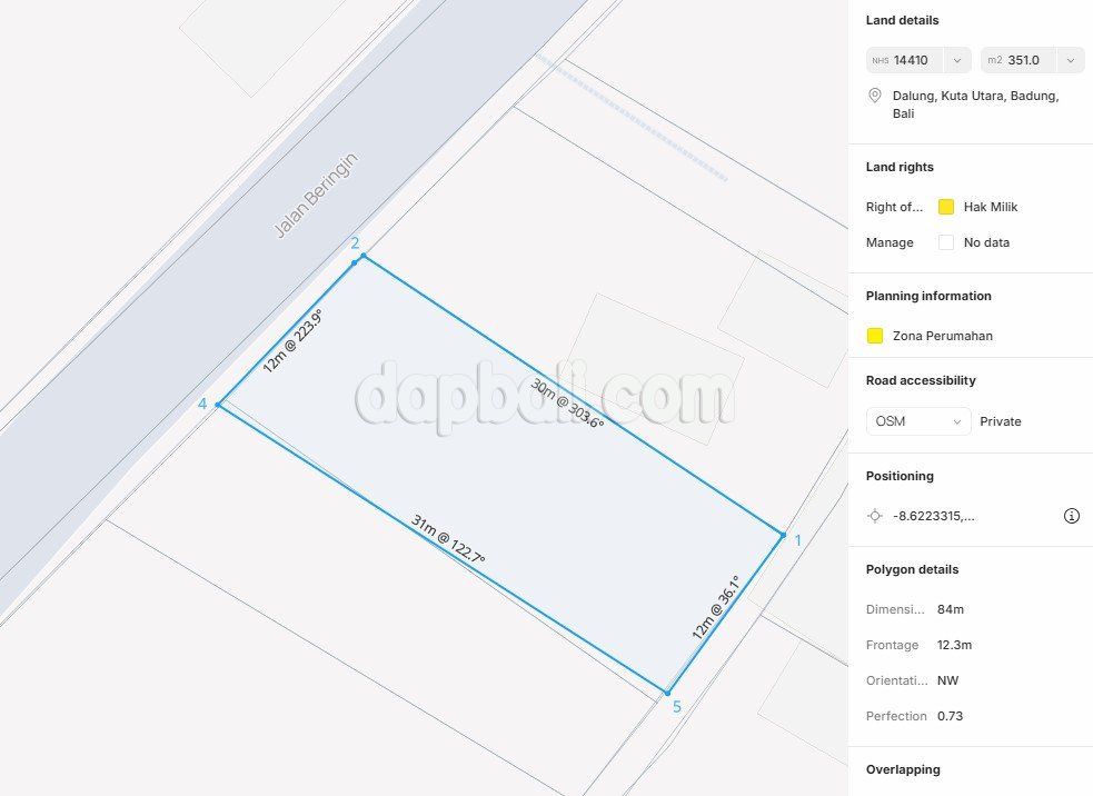 This 3.51 are (351 m²) freehold land (SHM) is strategically positioned right on Jalan Beringin, offering excellent visibility and convenient access. With its dimensions of 12.13 x 29.73 meters, the land provides an ideal layout for building a luxury villa, private residence, or boutique rental property. The surrounding neighborhood is peaceful yet highly accessible, with easy connections to major roads, supermarkets, restaurants, and popular destinations in Canggu and Seminyak. The area continues to grow rapidly, ensuring strong potential for both capital appreciation and rental yield. This land is ready to build, flat, and equipped with easy access to public utilities. Whether you’re planning to develop your dream villa or invest in a profitable property project, this site offers the perfect blend of convenience, tranquility, and long-term value. A truly strategic and promising land investment in Bali’s thriving property market.
