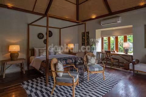 Inside, the home features four spacious bedrooms, each with an ensuite bathroom and its own unique charm. Large glass doors frame stunning views of the garden and ocean, flooding the interiors with natural light. The private yoga studio offers a quiet sanctuary for morning meditations or sunset stretches — a rare luxury that complements the home’s tranquil atmosphere. For leisure and entertainment, the villa includes a dedicated recreation room with a billiard table and a comfortable TV lounge, creating the perfect space for gathering with friends and family. The staff kitchen and dining area are designed for efficient service, ideal for private catering or hosting intimate events. Built in 2007 with a valid IMB, the property is well-maintained and equipped with 33,000 watts of electricity and a deep well water source, ensuring both comfort and sustainability. The villa also benefits from access to a shared tennis court, adding an active touch to the relaxed tropical lifestyle.