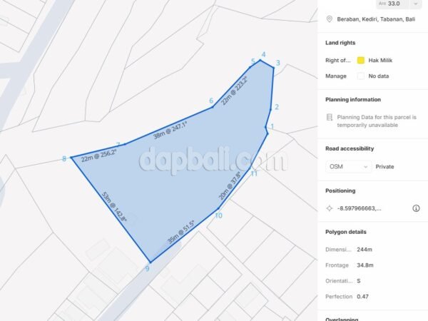 This beautiful plot is located in Desa Beraban, Tabanan, an area known for its natural landscapes, peaceful surroundings, and growing interest from nature-focused villa developers. Although the total land size measures 33 are (3,300 m²), only 10 are (1,000 m²) are available for lease, offering an ideal portion for a private retreat project or agricultural-based development. This land is offered at IDR 18,000,000 per are per year for a long-term 25-year lease, providing ample time to develop, enjoy, or operate the property for rental or personal use. With a 5-meter access road, the plot is conveniently reachable by car and construction vehicles, making development logistics smooth and efficient. Located within a green agricultural zoning, the land is surrounded by peaceful rice fields and open landscapes. While zoning regulations prioritize agricultural use and limit commercial or residential building options, this area is well-suited for eco-concepts such as wooden houses, bamboo structures, glamping units, organic farming, or other nature-based projects that align with the zoning guidelines. The property offers stunning rice field views, a hallmark of Tabanan’s natural charm, along with expansive mountain vistas that create a serene and refreshing atmosphere. These unobstructed views add significant value to the land, making it ideal for anyone seeking an escape from dense tourism areas while still remaining within reach of Bali’s west-coast attractions. Beraban is strategically located near Tanah Lot, Nyanyi, and other rapidly developing regions, making it a promising area for long-term investment. With its open landscapes, strong natural appeal, and affordable lease price, this plot provides an exceptional opportunity for those who appreciate tranquility, nature, and potential for future appreciation. Whether you envision a small private sanctuary, eco-friendly accommodation, or a nature-integrated project, this Beraban land offers both beauty and potential.
