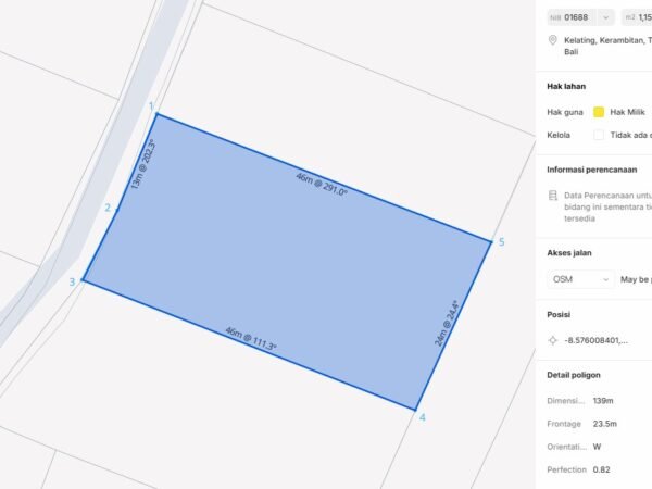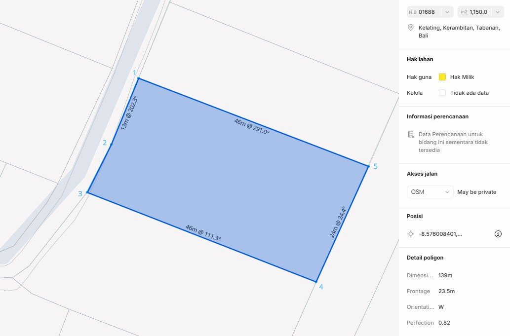 A well-positioned parcel of land located in Kelating, Tabanan Regency, offering a peaceful setting surrounded by rice fields while remaining close to Bali’s west coast. This property sits within a Pink / Tourism zoning, making it suitable for tourism-related developments such as villas, boutique resorts, or hospitality projects. The land spans 11.5 are (1,150 m²) with a flat contour, ensuring efficient and cost-effective construction. Accessible via an approximately 4-meter-wide road, the plot is surrounded by a mix of rice fields, local residences, and villas—creating a balanced environment between tranquility and development potential. One of its key advantages is its close proximity to Kelating Beach, an emerging coastal destination in Tabanan known for its natural charm and growing interest among developers.