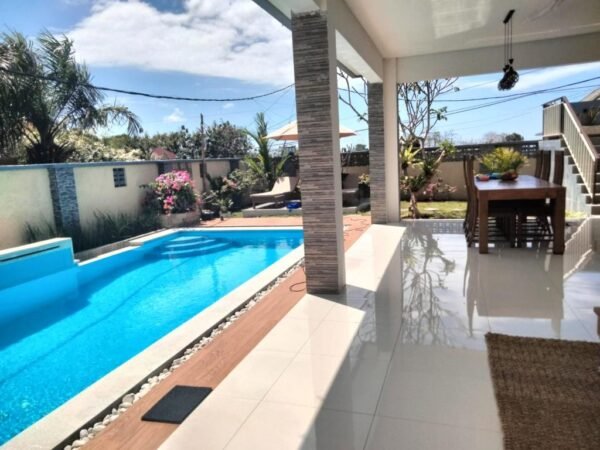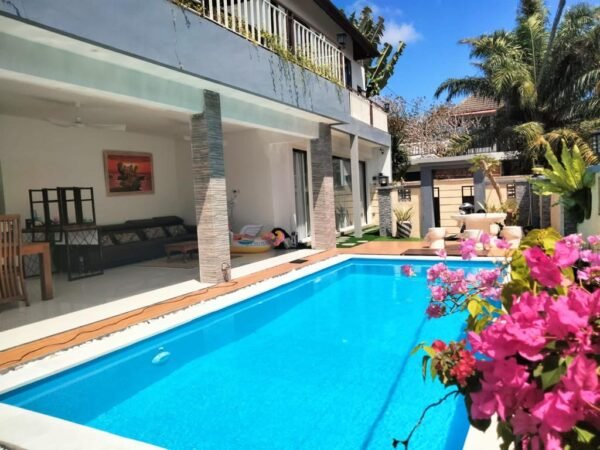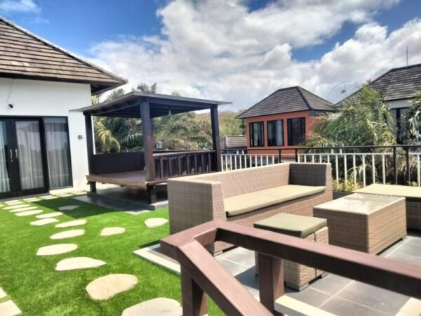 Outdoor features include a private swimming pool (3 x 7 meters), a landscaped garden, and a large balcony furnished with a sofa and gazebo—ideal for relaxing while enjoying the ocean breeze. The villa also comes with a garage, PDAM water supply, and 3,500-watt electricity. The villa is offered fully furnished, allowing immediate occupancy or rental use. It holds a Freehold Title (SHM) with a complete Building Permit (IMB – 2014) and benefits from 6-meter main road access, ensuring excellent accessibility.