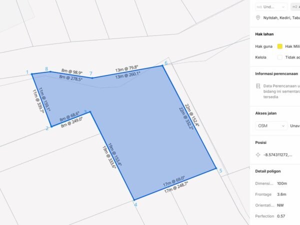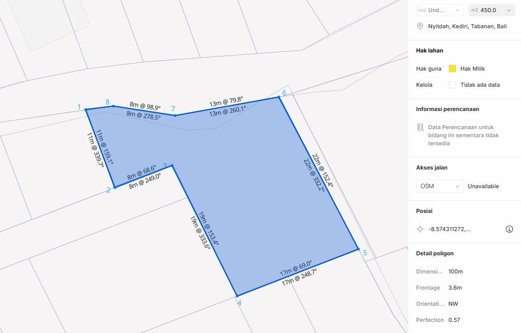 This land for sale is located in Nyitdah, Kediri – Tabanan, a peaceful and developing area that offers an excellent balance between residential comfort and natural surroundings. With a total land size of 450 sqm (4.5 are), the property features a flat contour, making it ideal for immediate construction without additional land preparation costs. The land is situated in a residential zoning (Perumahan) area and comes with freehold ownership (SHM), ensuring strong legal security for both local and foreign investors. Access is convenient with a ±5-meter-wide road, suitable for cars and construction vehicles. Surrounded by private villas, housing complexes, and scenic rice fields, this land is perfect for developing a private residence or a rental villa. Offered at a competitive price of IDR 320 million per are (nett), this property presents an attractive investment opportunity in Tabanan’s growing market.