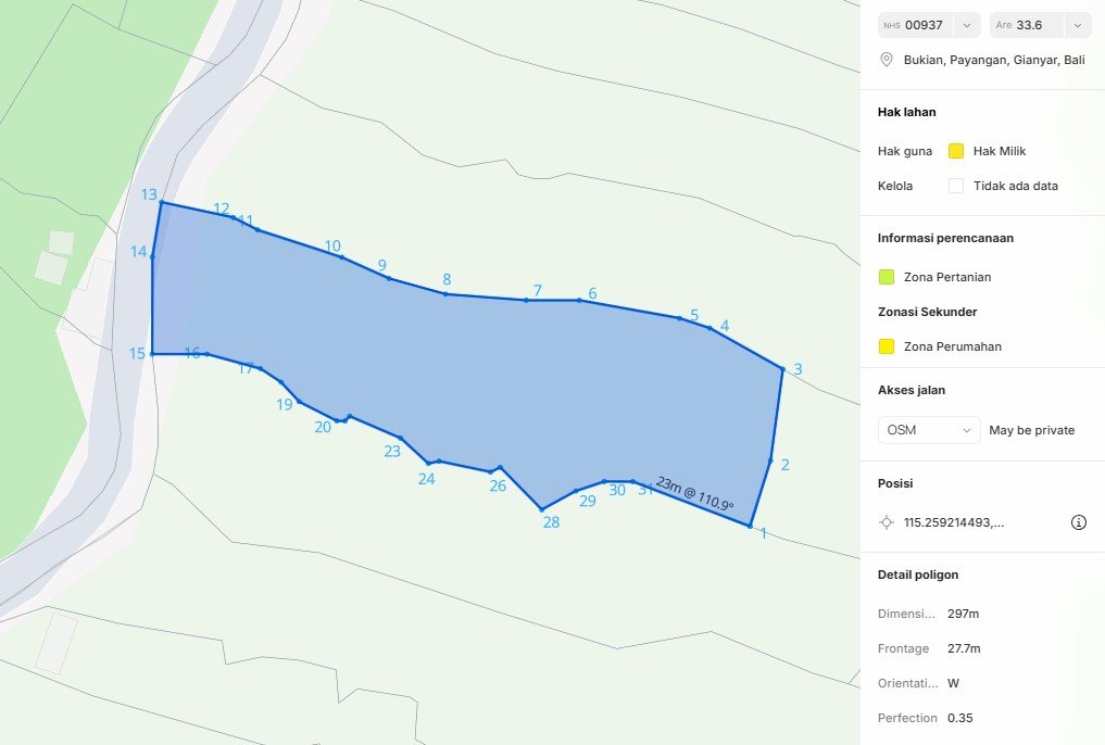 Located in Bukian Village, near Villa Christian Sugiono, this 33.6 are residential land offers a quiet natural atmosphere with easy access and wide road frontage—perfect for a private villa or long-term investment.