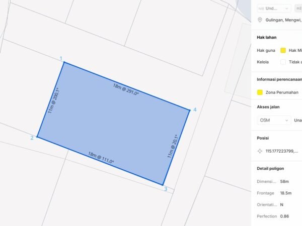 This strategically located land is situated in Gulingan – Mengwi, Badung, a growing area with excellent access to public facilities and daily necessities. Based on the map location, the land is situated approximately 25 meters from the main road, offering convenience while maintaining a quiet and comfortable environment—ideal for both residential and investment purposes. With a gentle sloping contour and a total size of 200 m² (2 areas), the land is suitable for a split-level design. The surrounding area continues to grow, making this property perfect for a private residence, boarding house (kost), villa, or long-term land investment.