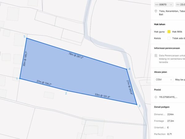 Located in Tista, Kerambitan, Tabanan, this freehold land offers a peaceful countryside setting surrounded by lush rice fields and mountain scenery. The land is easily accessible by car, positioned higher than the road (reducing flood risk), and situated in a quiet, low-density neighborhood—ideal for residential or villa development. This property is offered as 11 are (1,100 m²) from a global 23 are, with the option to split into 5 are and 6 are, providing flexibility for different development plans. The land features a flat contour, making it ready to build, and benefits from two road accesses (front and north side)—a valuable advantage for layout design, privacy, and circulation. Surrounded by greenery and fresh air, this location is perfect for a private residence, boutique villa, eco-retreat, or long-term investment in Tabanan, an area known for steady growth and strong future potential.
