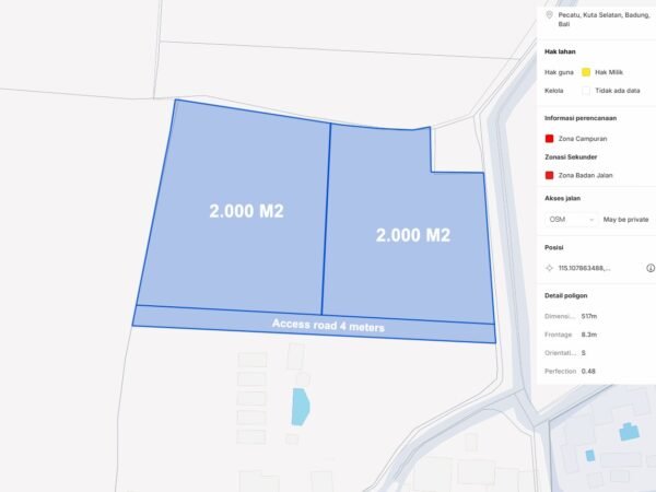 Located near Nunggalan Beach, Pecatu – Uluwatu, this land sits in one of Bali’s most iconic coastal destinations. This land is in proximity to the beach area with easy 5-meter road access, surrounded by cliffs, ocean views, and established tourism developments. Uluwatu is internationally known for luxury villas, beach clubs, and strong tourism demand, making this location highly attractive for long-term investment.