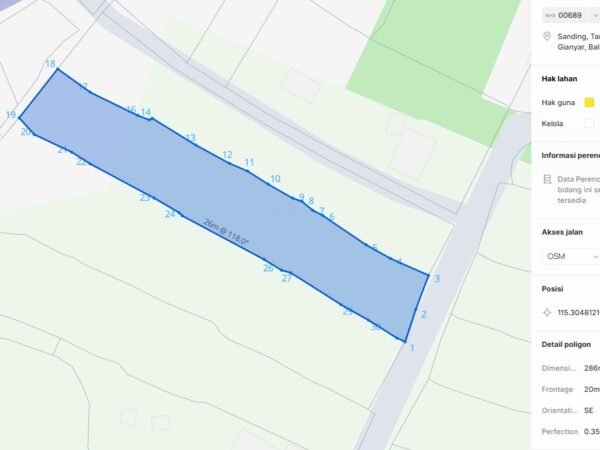 A rare opportunity to acquire large freehold land in Sanding, a peaceful and rapidly developing area located along the corridor near Ubud. This property offers a perfect balance of natural beauty, accessibility, and strong development potential, making it ideal for villa compounds, boutique resorts, private residences, or long-term investment. The land features a beautiful rice field view, wide frontage, and direct access from a main asphalt road, ensuring ease of development and excellent future value. The surrounding area is a well-established villa zone, close to luxury hospitality projects and nature attractions. Conveniently located approximately 25 minutes from the center of Ubud, the property provides a tranquil setting while remaining well-connected.