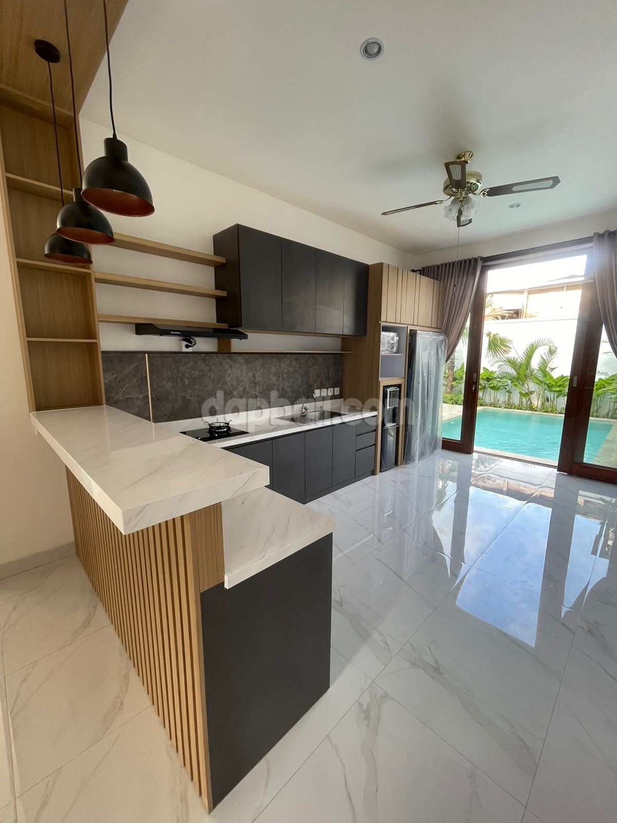 • Kitchen ensuite dining room is direct access to swimming pool by glass sliding door, equipped with modern kitchen set, wasteful, a cooktop, etc