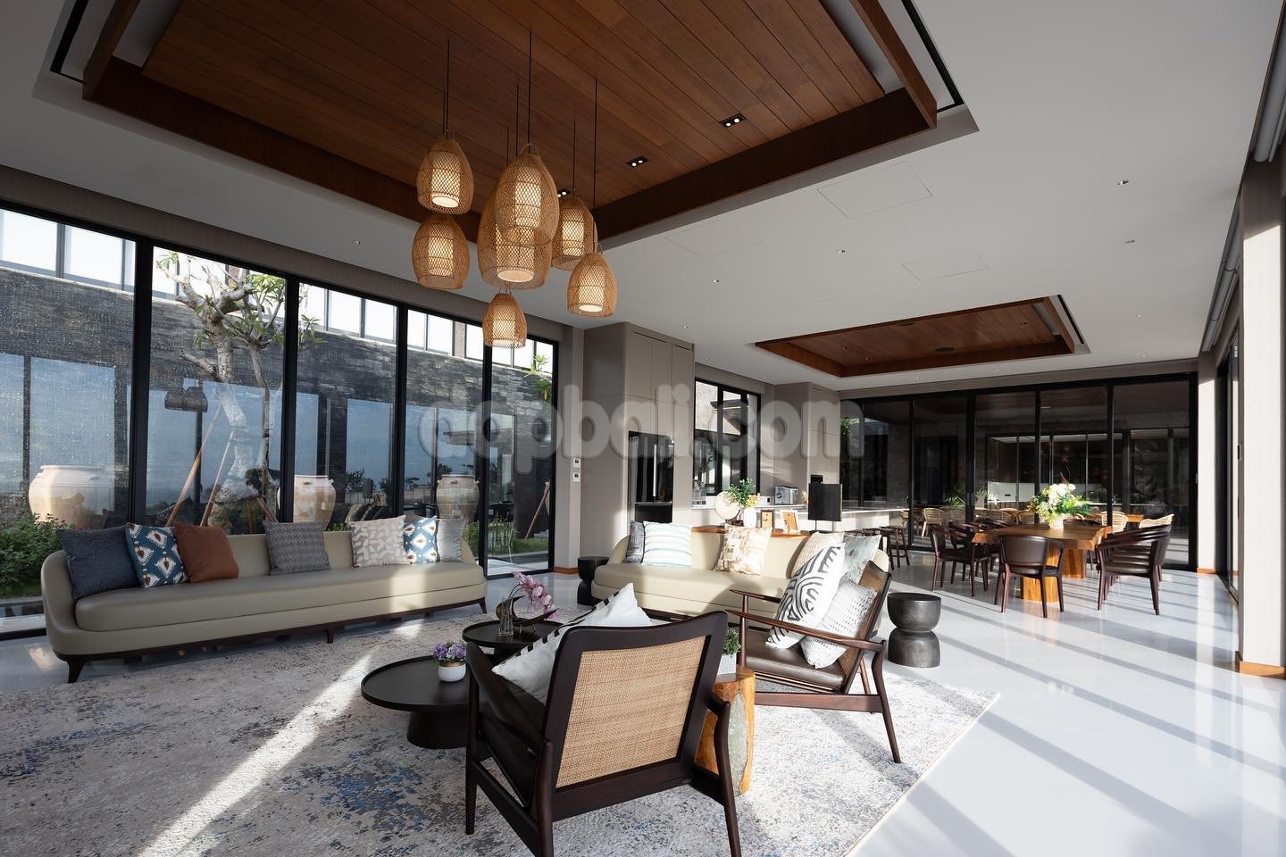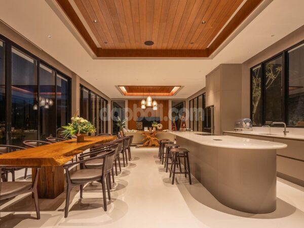 • DINING ROOMS: There are two indoor dining rooms in the villa, one is located in the kitchen area with strong elegant wooden dining table and the one is located in the living/media area and also outdoor dining area is located in a covered verandah with fabulous views of the sea and the pools, with a 14-seater table