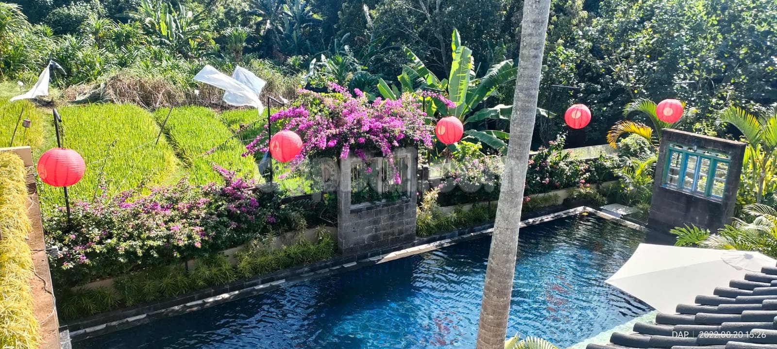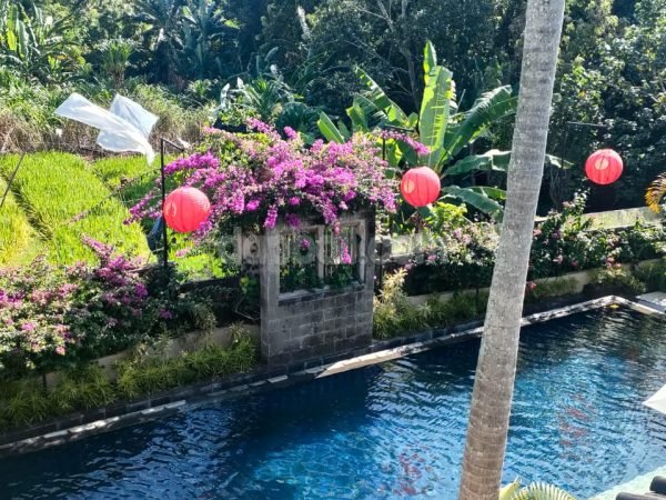 The second building offers one spacious en-suite bedroom with riverview ,a large swimming pool size 4 x 12 meters with overlooking the rice field and jungle as well as the spacious spot for sun bathing and tanning.